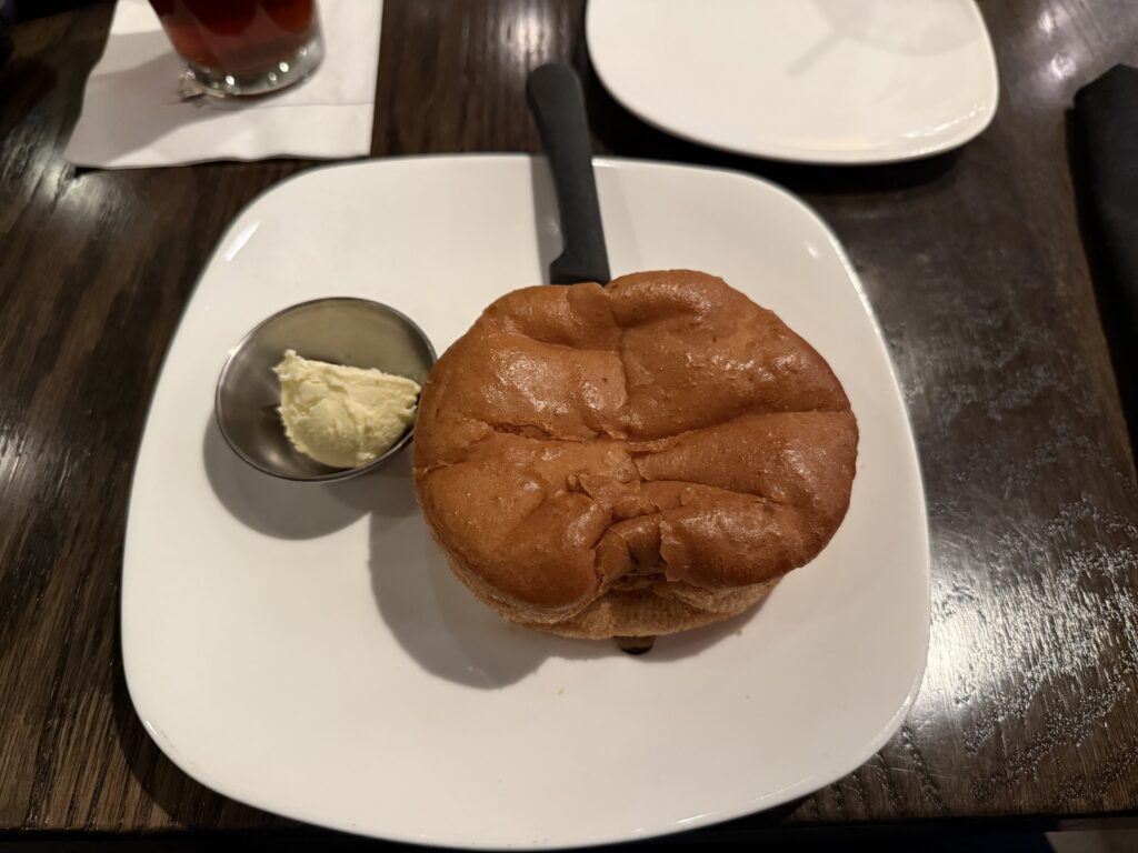 There are a lot of choices on the menu for gluten-free. The server was quick to note that they cannot guarantee an absence of cross-contamination, but that they do take precautions as they can. After a few minutes, some hot gluten-free bread was brought out to the table for me to enjoy. This taste very similar to the rolls from Disney to be honest. It is just a much larger version.