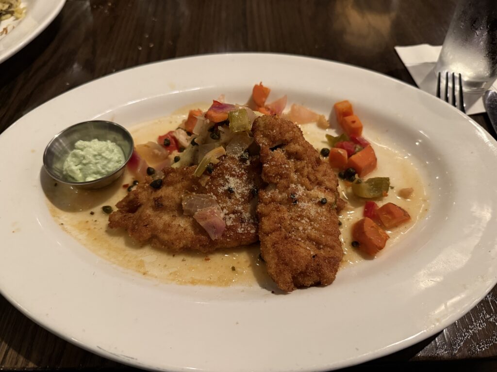 For my meal, I chose to have the Chicken Giardiniera. I asked if they could put the wasabi butter on the side of the mashed potatoes to try. I was a little underwhelmed with the mashed potatoes, but the wasabi butter added a nice touch and flavor. The Parmesan crusted chicken was very good. The pickled vegetables were a little underwhelming. The sauce was a little spicy, which was surprising.