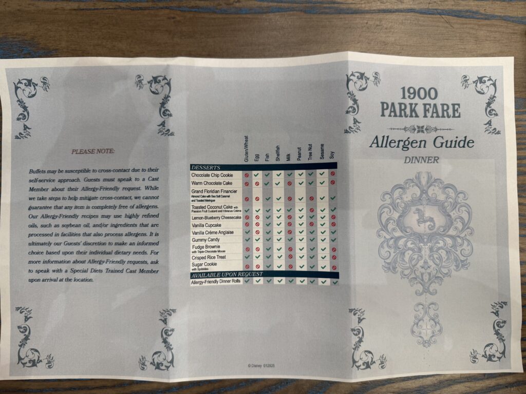 Looking through the menu, there was only one option really. It was a toasted coconut cake. I am not a coconut fan, so I skipped. The crispy treats that were listed were quickly out, as I saw so many people using one set of utensils to pick up all sorts of desserts. Most of the crispy treats had pieces of cake and other gluten-containing items on them. I usually love having dessert at Disney restaurants, so this was extremely disappointing.