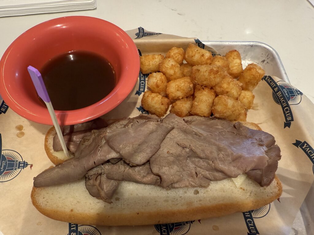 The sandwich wasn’t bad. The bread is pretty dense, similar to the other gluten-free bread that Disney has. It paired well with the dip for the sandwich as it soaked it up nicely. Again, nothing amazing but I’ve had much worse in many other places. The tater tots were just plain tater tots, but cooked separately and were tasty.