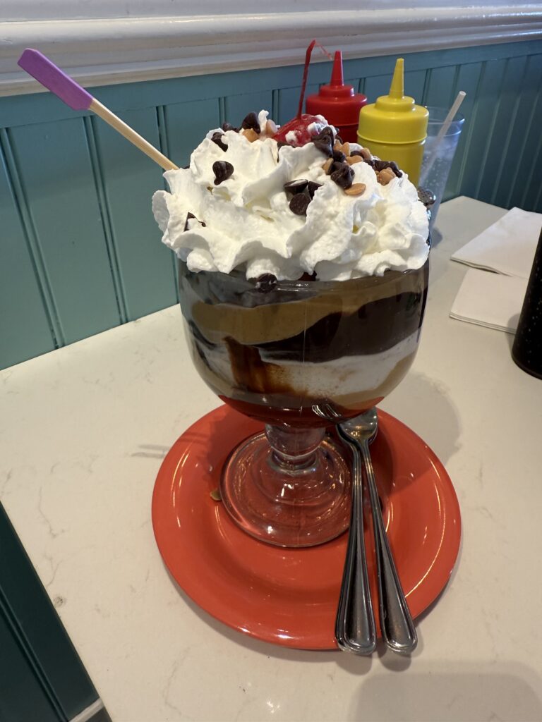 On this visit, my son and I also split the No Way Jose dessert. It has chocolate and vanilla ice cream mixed with peanut butter and chocolate morsels, hot fudge, peanut butter, and a lot of whipped cream. It was delicious and it was excellent knowing all the items were safe to eat.