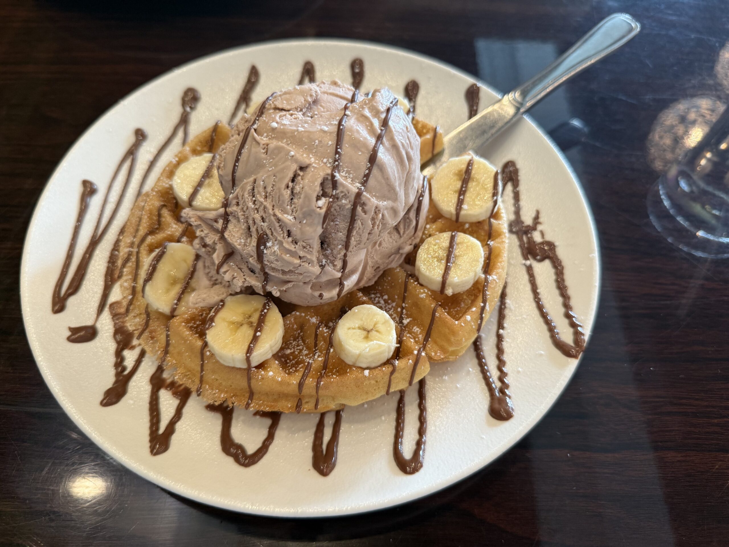 The waffle was an excellent pairing with the ice cream. It was not a typical heavy waffle. It was light and fluffy, not sweet at all. The ice cream was not extremely sweet either. The banana was cold so it went well with the warm waffle.