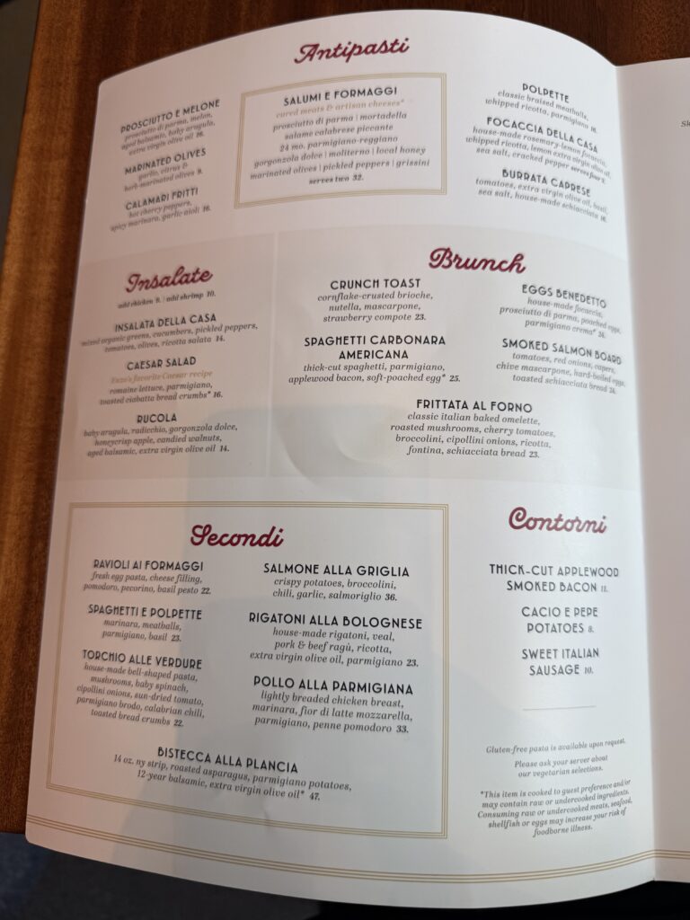 The menu does not designate anything that is gluten-free. It only says gluten-free pasta is available on request. The server acknowledged that most everything can be gluten-free, but there is a risk of cross contamination. If you are celiac, you better keep this in mind!